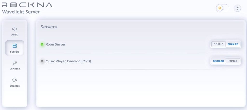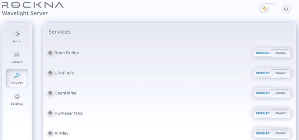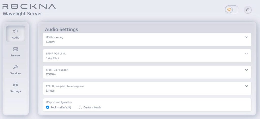 Il WLS dispone di una potente interfaccia di controllo ovvero una app a cui è possibile accedere tramite browser locale oppure da uno smartphone o tablet. Consente di gestire l’archiviazione interna o collegata, selezionare software o servizi attivi, selezionare parametri di sovracampionamento o transcodifica, selezionare l’impostazione dell’uscita I2S per la compatibilità con DAC non Rockna, copiare cd su unità locali, abilitare la correzione della stanza ecc.