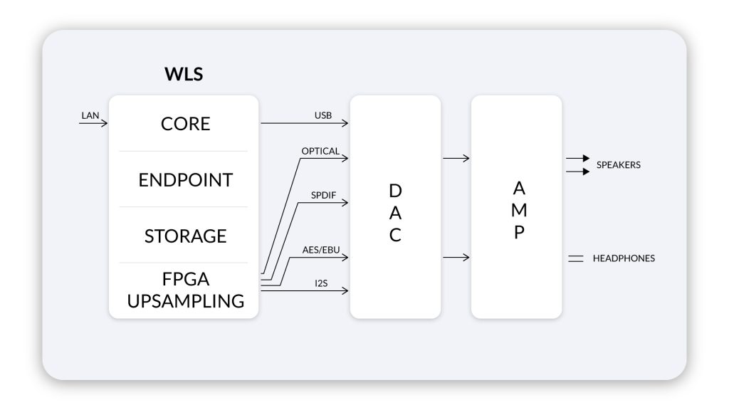 Il WLS combina alcuni elementi chiave per la riproduzione audio digitale basata su server: contiene un alimentatore lineare, un sistema informatico a basso TDP che esegue una versione Linux personalizzata, un sistema FPGA/DSP altamente efficiente per la gestione dell’audio.