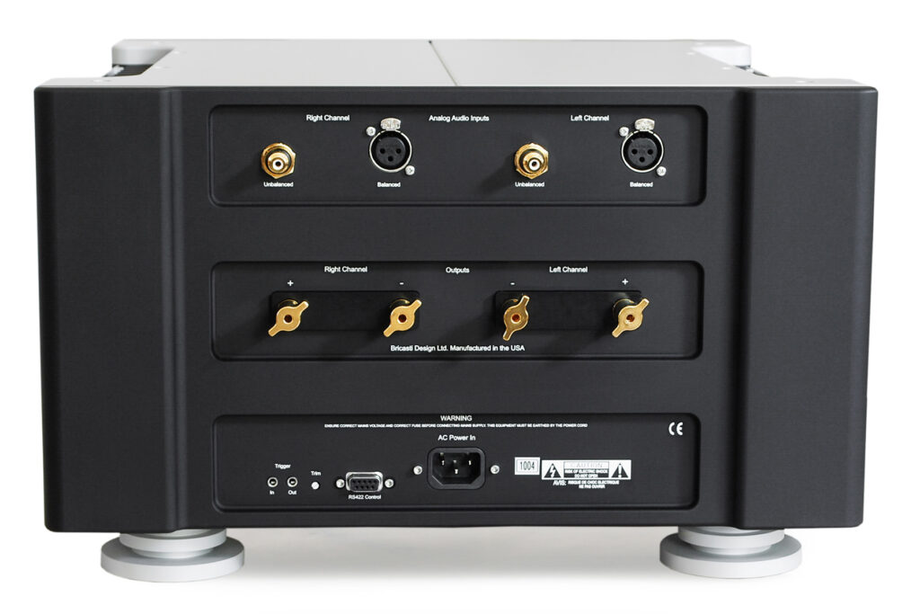 A una distanza ragionevole sotto, nella sezione inferiore, si trovano, da sinistra a destra, l’ingresso/uscita trigger, una porta RS-422 attualmente utilizzata solo per la diagnostica, un controllo di trim a scatto che può abbassare la sensibilità di ingresso in quattro step da 6 dB ciascuno, per adattarsi meglio all’uscita di un preamplificatore o DAC, e un connettore IEC a tre poli. Non ho mai sentito la necessità di modificare la sensibilità di ingresso dell’amplificatore. Né, grazie al design intelligente del pannello posteriore, ho mai dovuto preoccuparmi che i cavi di interconnessione o i cavi dei diffusori trasmettessero rumori indesiderati entrando in contatto con il cavo di alimentazione.