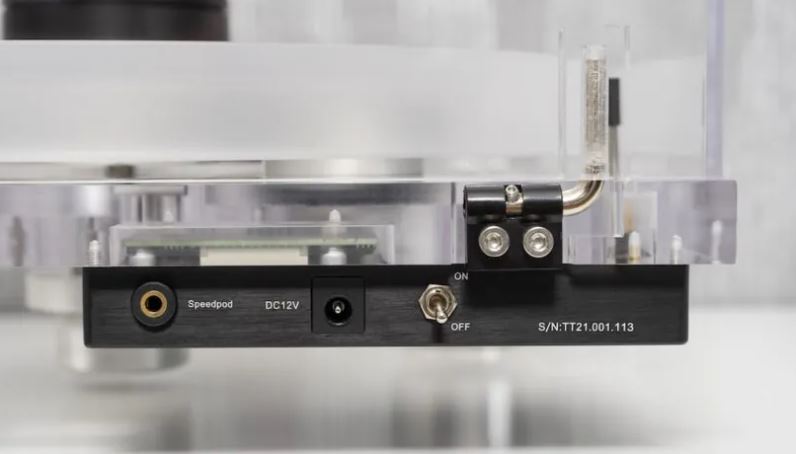 Anche il sistema di trascinamento è stato implementato con notevole impegno. Viene impiegato un motore a corrente continua di alta qualità con controllo elettronico della velocità e monitoraggio continuo della velocità. Il motore, disaccoppiato dal telaio in acrilico, è posizionato in un alloggiamento separato ed è ulteriormente smorzato internamente da materiali smorzanti. Per ridurre al minimo la trasmissione del rumore esterno, una solida copertura metallica incapsula completamente il motore, ad eccezione di due fessure per la cinghia. Un sistema di sensori garantisce una rotazione precisa e costante, senza fluttuazioni o deviazioni dalla velocità esatta: un anello magnetico è posizionato sotto il contropiatto e un sensore Hall, alloggiato nel telaio, registra il movimento magnetico. Insieme, questi formano un sistema di rilevamento elettronico che misura costantemente la velocità e corregge immediatamente eventuali deviazioni. La velocità può essere selezionata tra 33⅓ e 45 giri/min e il motore può essere spento manualmente tramite la leva sul telaio, oppure elettronicamente tramite lo SpeedPod esterno: lo SpeedPod consente anche regolazioni precise della velocità con incrementi di 1/100 di giro/min. Ciò consente di correggere eventuali digressioni di tono del disco.