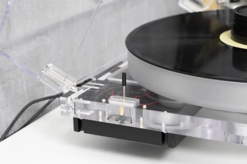 Il telaio in acrilico spesso due centimetri del nostro modello di prova è trasparente. Questo conferisce al giradischi un aspetto meravigliosamente lucido, arioso e leggero. Questo è ulteriormente esaltato dal coperchio antipolvere, anch’esso in plexiglass trasparente, e dal piatto, anch’esso in acrilico ma con finitura satinata. Il TT Level 2.1DC è disponibile anche con telaio nero. Tuttavia, l’aspetto trasparente è il nostro preferito. La finitura satinata del piatto è un’ingegnosa caratteristica di design: la sua limitata trasparenza nasconde il motore sottostante e parte dell’elettronica posteriore e della sezione di collegamento. Il fatto che il piatto, che pesa poco più di un chilogrammo, sia anch’esso realizzato in acrilico ha una ragione acustica: l’acrilico ha proprietà di risonanza simili a quelle del vinile. Grazie al contatto diretto con il disco, il piatto e il disco formano essenzialmente un’unica massa smorzante. Quando lo stilo in movimento fa vibrare il disco, queste vibrazioni vengono assorbite e non riflesse sullo stilo, prevenendo così il degrado del suono.