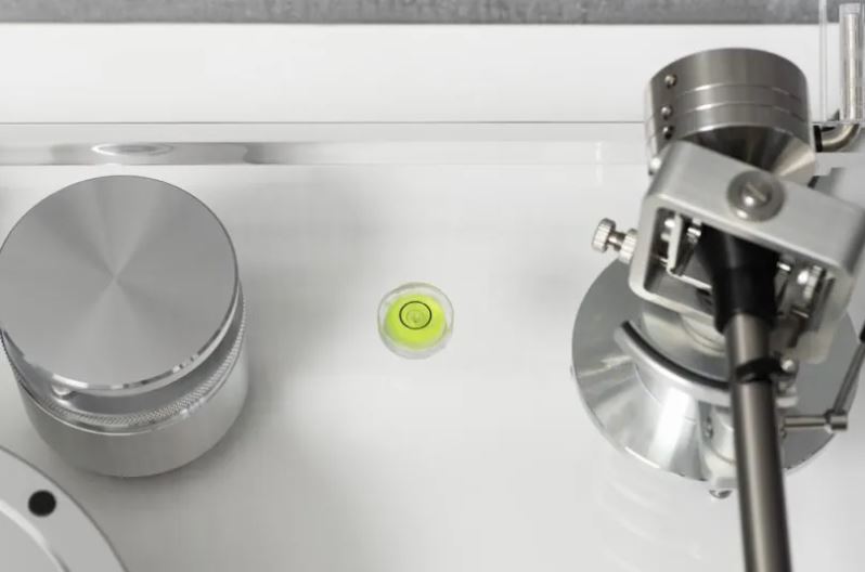 A proposito di livellamento: per compensare le superfici irregolari, il TT Level 2.1DC poggia su tre piedini. Questo garantisce che il giradischi sia sempre stabile e senza oscillazioni. Questa stabilità è garantita da piedini cilindrici in metallo le cui notevoli dimensioni e la struttura multicomponente aumentano ulteriormente le sorprendenti prestazioni del giradischi. I piedini sono dotati di un sistema integrato di smorzamento delle vibrazioni. Questo blocca efficacemente le vibrazioni trasmesse al giradischi attraverso il pavimento e la superficie, neutralizzando al contempo le vibrazioni generate dal meccanismo di trasmissione stesso. Tutti e tre i piedini sono regolabili in altezza, consentendo al giradischi di essere perfettamente livellato. Questa assenza di inclinazione impedisce che forze indesiderate verso il basso agiscano sulla puntina, il che causerebbe un tracciamento impreciso e una maggiore usura dei dischi. Una livella a bolla è comodamente integrata nel telaio in acrilico per il livellamento: una caratteristica tanto elegante quanto intelligente.