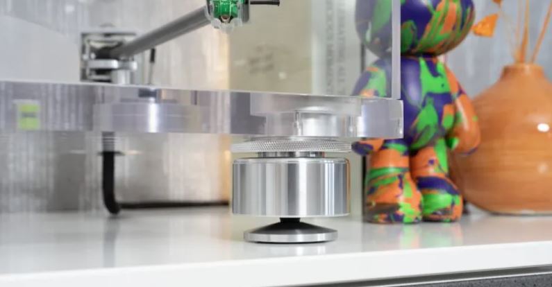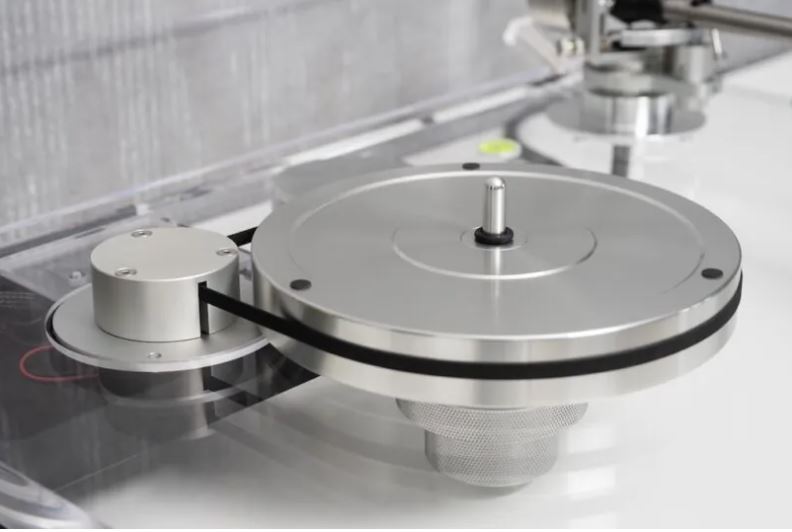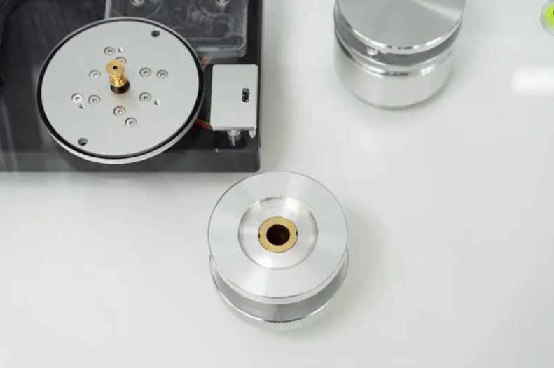 Per l’assorbimento delle vibrazioni vengono impiegate diverse misure di disaccoppiamento: il foro del piatto è più grande del diametro del perno che lo attraversa. Un anello di gomma isolante circonda anche il perno in quest’area. Tamponi di gomma disaccoppiano il piatto dal contropiatto. Il contropiatto è essenzialmente il centro di rotazione e vibrazione: la cinghia, che aziona il motore, scorre lungo il contropiatto. Il perno è inserito nel contropiatto e ruota su un cuscinetto a sfere in acciaio. Il piatto poggia e ruota sul contropiatto. Per soddisfare i requisiti di robustezza, resistenza alle vibrazioni e funzionamento fluido, il contropiatto è fresato in alluminio pieno e bilanciato con precisione. Il perno inserito al suo interno è realizzato in ceramica. L’estrema durezza e scorrevolezza di questo materiale garantiscono un attrito costantemente basso. Il perno scorre praticamente senza gioco in una boccola in ottone lavorata a mano con precisione. Il metallo morbido riduce ulteriormente l’attrito, così come la lubrificazione con un olio speciale.
